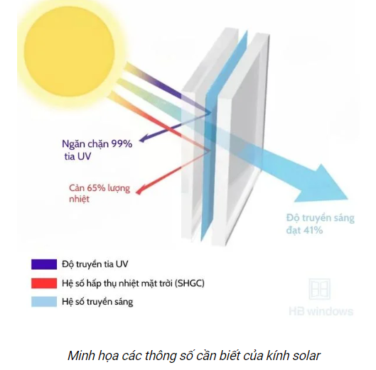 Kính solar sản xuất từ phôi kính trắng được phủ nhiều lớp kim loại siêu mỏng. Chức năng của lớp kim loại này làm cản 65% năng lượng từ mặt trời và hạn chế 99% lượng tia UV, dẫn đến nhiệt bên trong mát mẻ nhưng vẫn tận dụng được ánh sáng tự nhiên4. Ý nghĩa các thông số kỹ thuật của kính solar